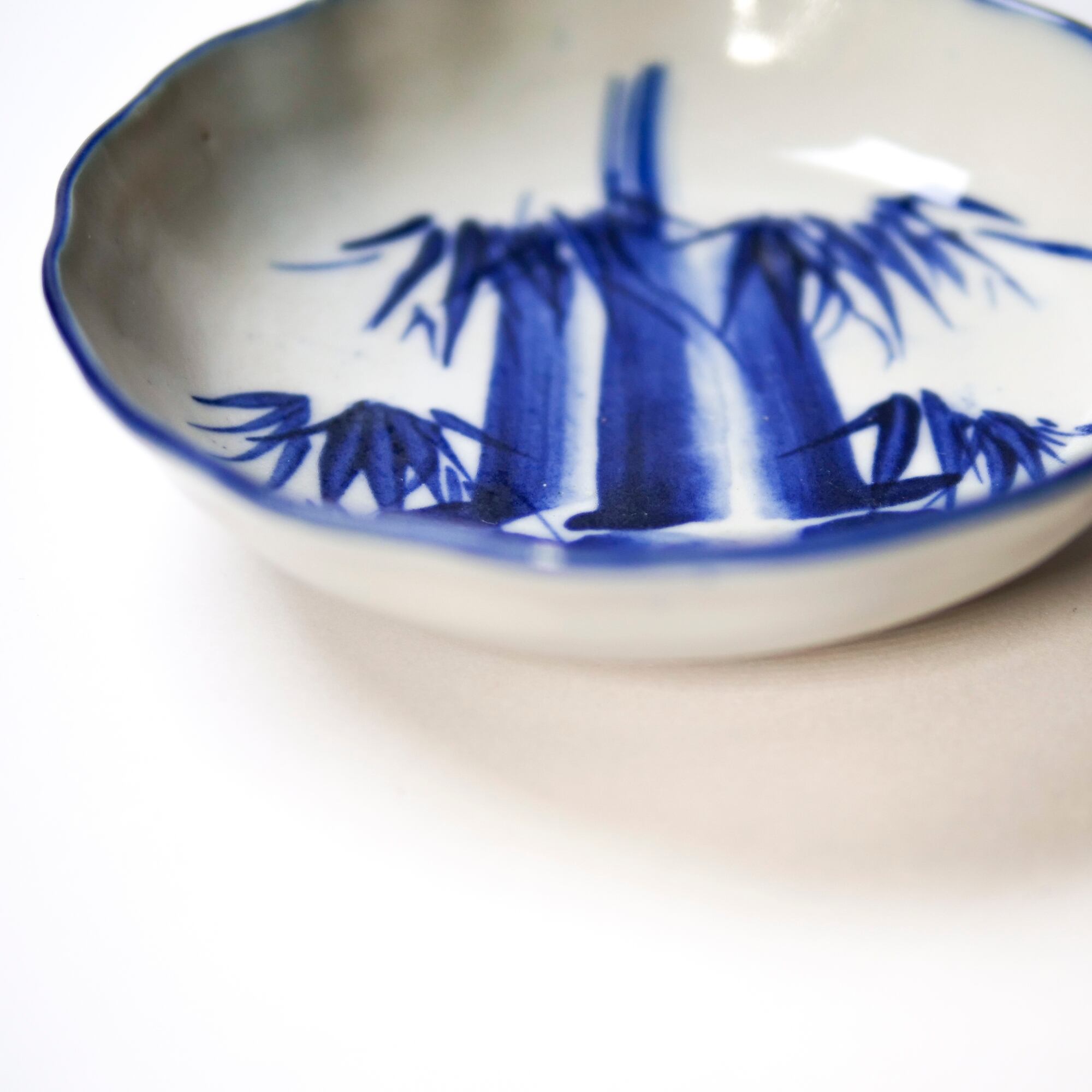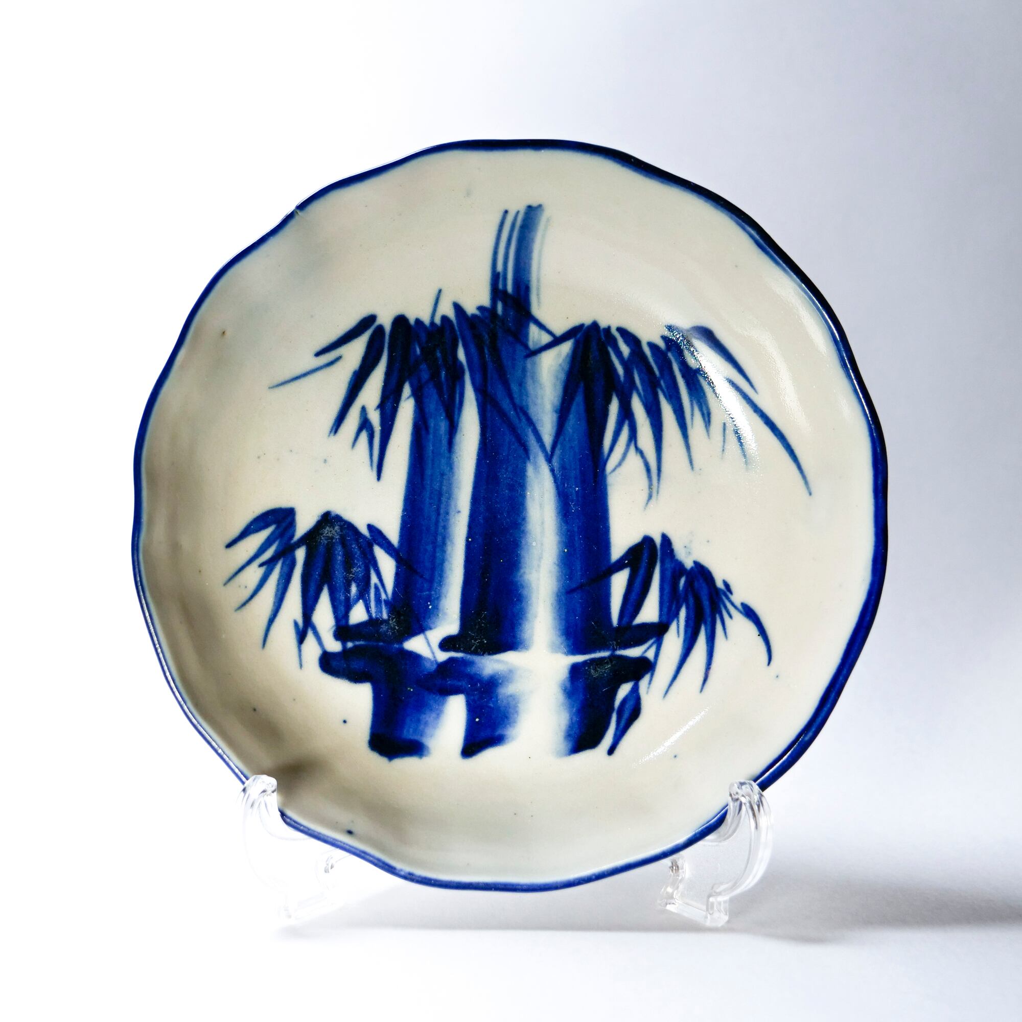 濃い藍の力強い筆致で描かれた竹紋様のなます皿です。